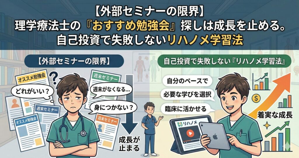 【外部セミナーの限界】理学療法士の「おすすめ勉強会」探しは成長を止める。自己投資で失敗しないリハノメ学習法