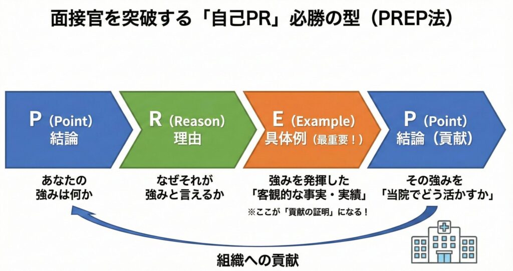 この「PREP法」 の型を使うと、先ほどワースト3で挙げた「学ばせてください型」 すら、強力な「貢献型」 の自己PRに変換できます。
