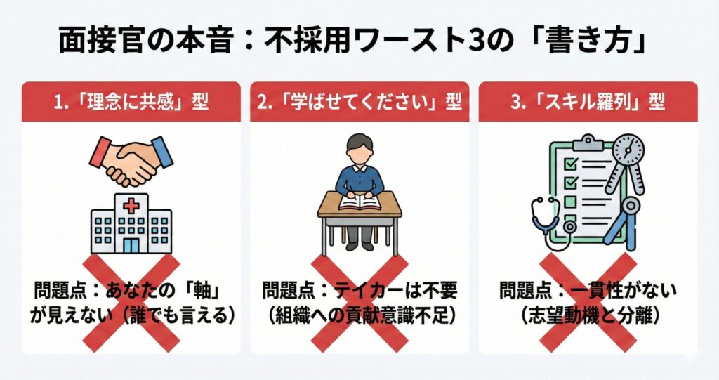 あなたの強みが、当院の理念や求める人材像とどう結びつくのか、その「一貫性」 が全く見えません。