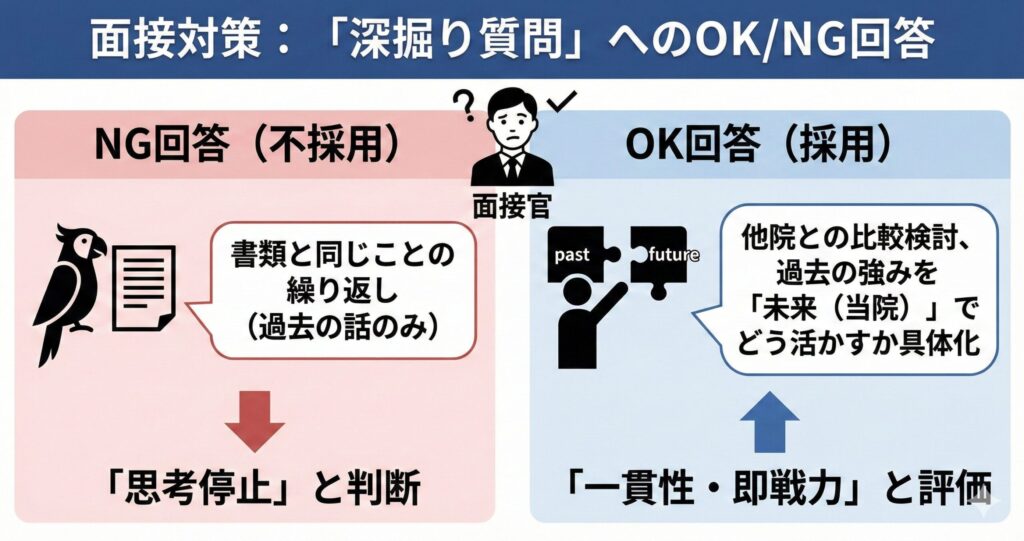 面接官が知りたいのは、「あなたの過去の強み(自己PR)を、未来(当院)でどう活かしてくれるのか(志望動機)」という「一貫したストーリー」 なのです。