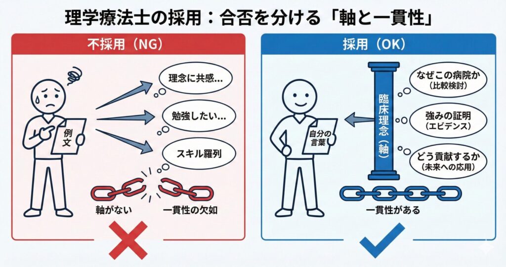 面接官が知りたいのは、その「理念」の上で、あなたの「臨床理念(軸)」 と「強み(自己PR)」 をどう発揮してくれるのか、です。