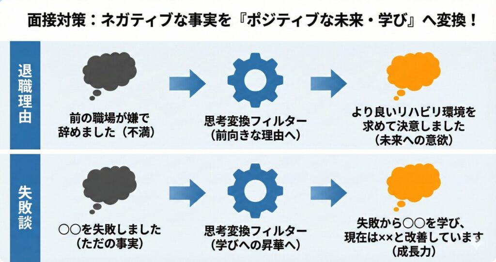 ネガティブをポジティブに変換して、「そこから何を学び、どう改善して今に至るか」を語ってください。
