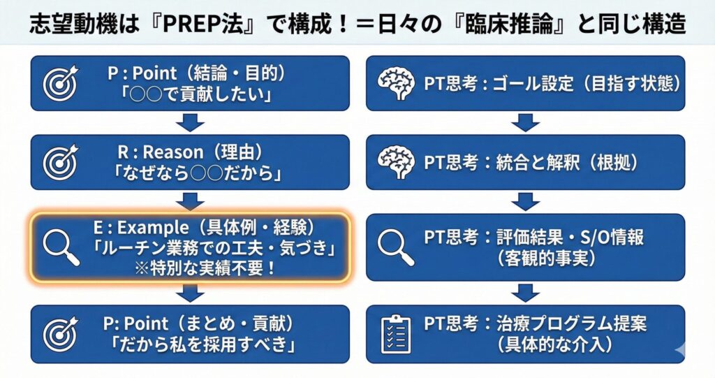 ここでは、多くの理学療法士が陥りがちな「残念な志望動機」を、先ほどのPREP法を使って「採用される志望動機」へと劇的に変化させてみましょう。