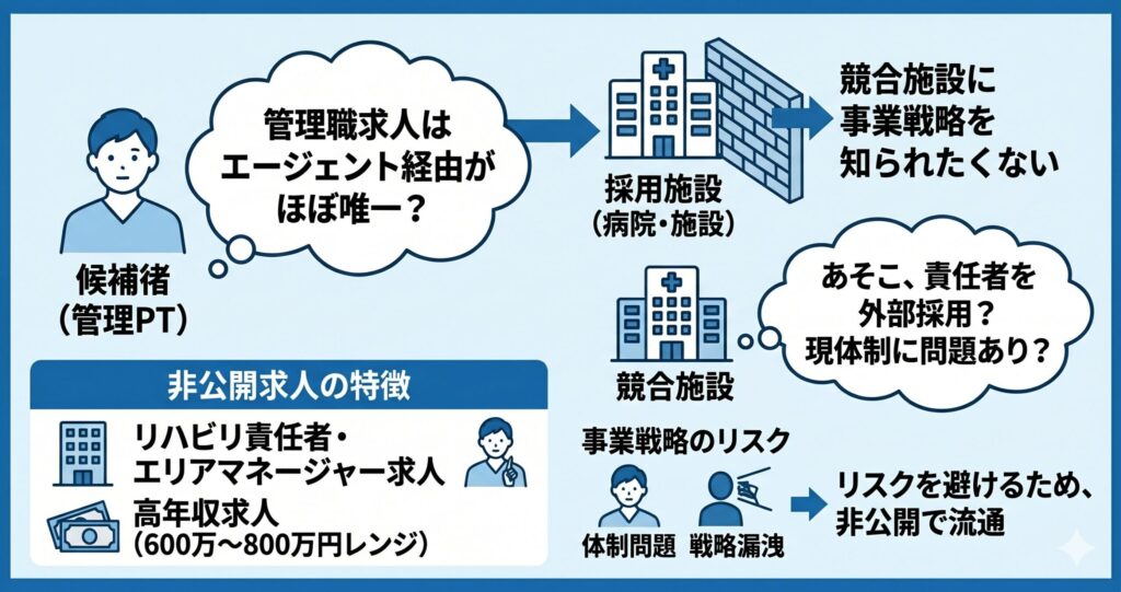 「リハビリ部門責任者を外部から採用する=現体制に何か問題がある」と推測されるリスクを避けるため、非公開求人としてエージェントにのみ出します。