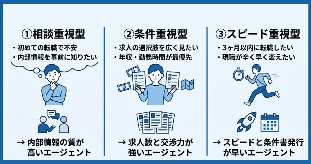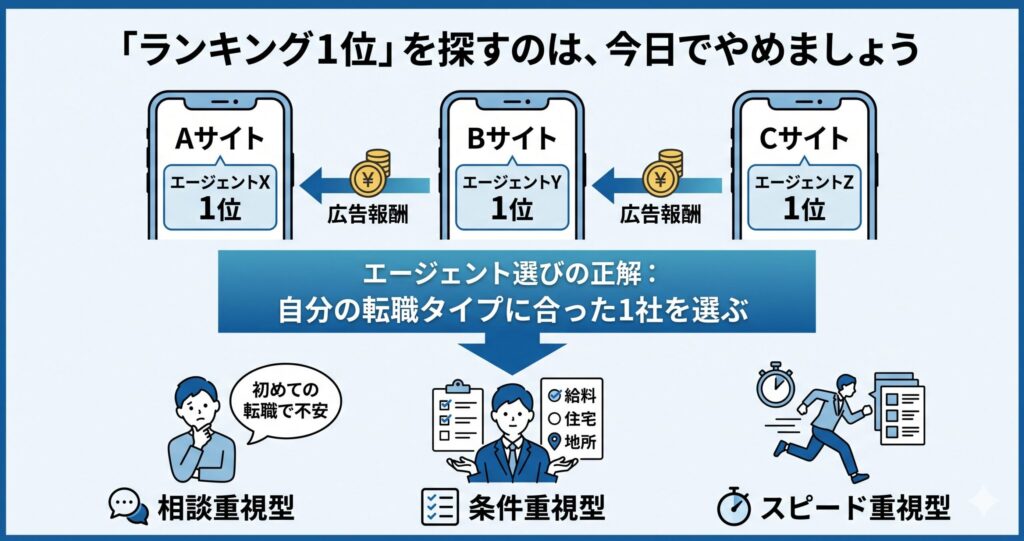 エージェント選びの正解は「1位を探す」ことではなく、自分の転職タイプに合った1社を選ぶことです。