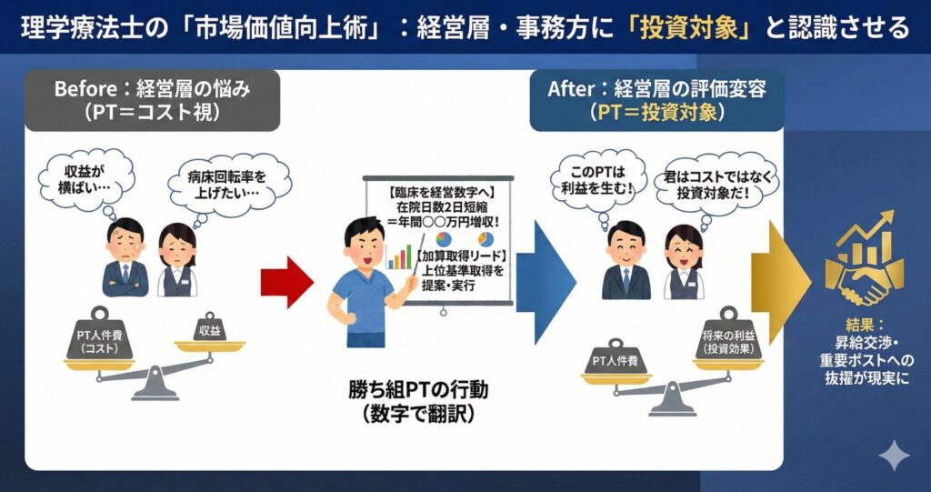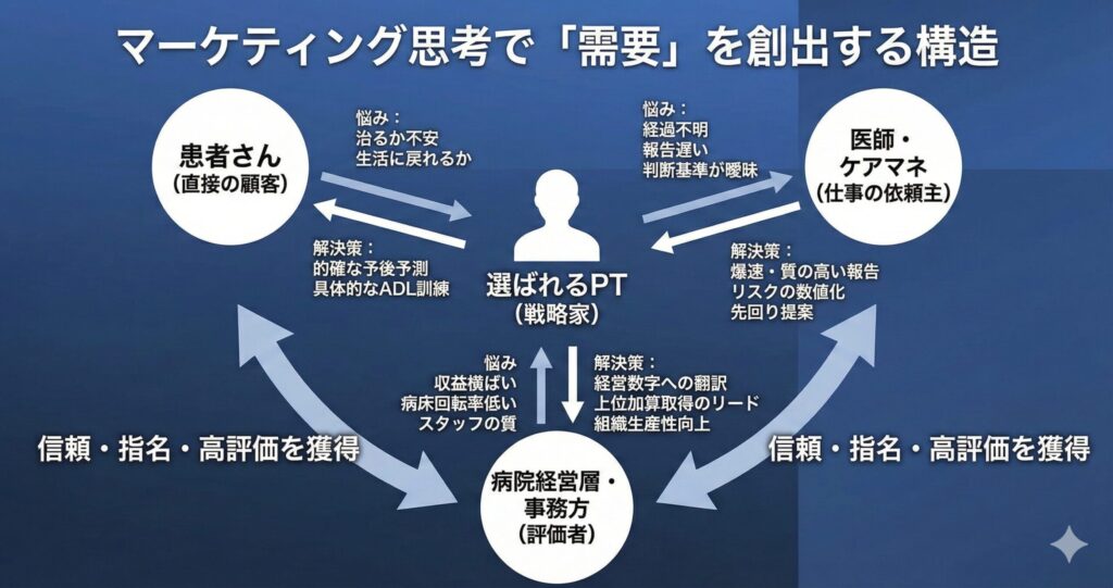 理学療法士が市場価値を高めるためにまず理解すべきは、「誰があなたを評価し、誰がお金を動かしているか」という視点です。