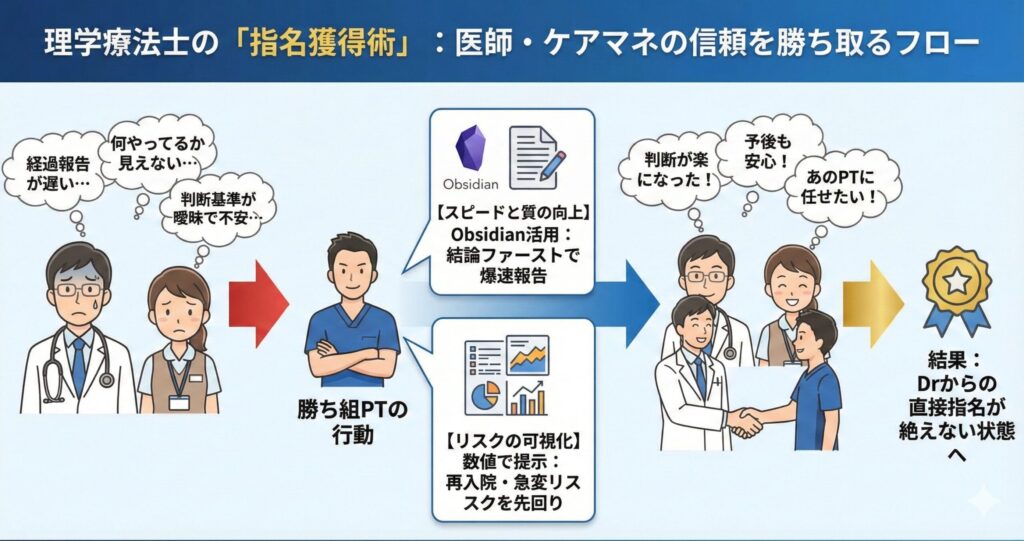 しかし、理学療法士として勝ち組になるためには、医師やケアマネ、そして経営層といった「利害関係者」の悩みを突き、彼らにとっての「解決策」になる必要があります。