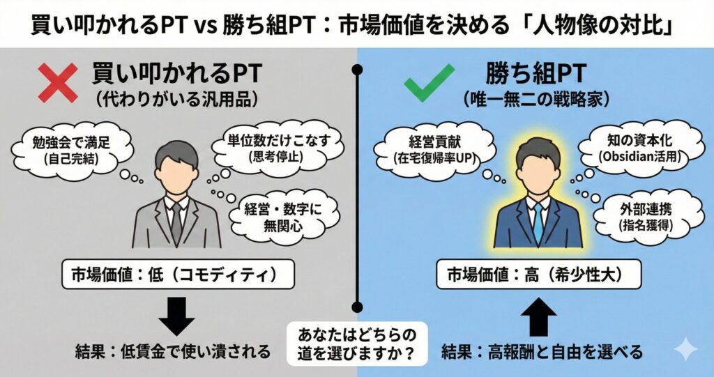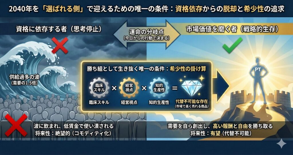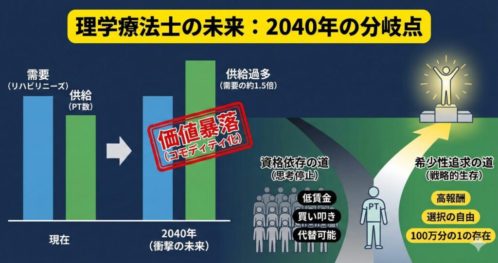 なぜなら、2040年に向けて理学療法士が溢れかえる未来において、組織にぶら下がっているだけの人間は、真っ先に「買い叩かれる対象」になるからです。