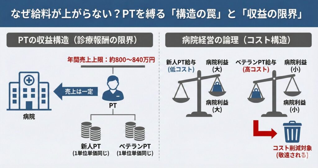 • 診療報酬の限界: PT一人が1年間に稼げる売上は、法律上「約800万円〜840万円」が限界。