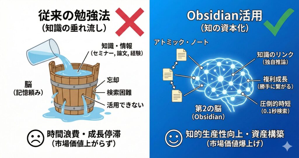 Obsidianを使いこなし、知的生産性を高めることは、供給過多の時代において「選ばれる側」に居続けるための最強の防衛策となります。