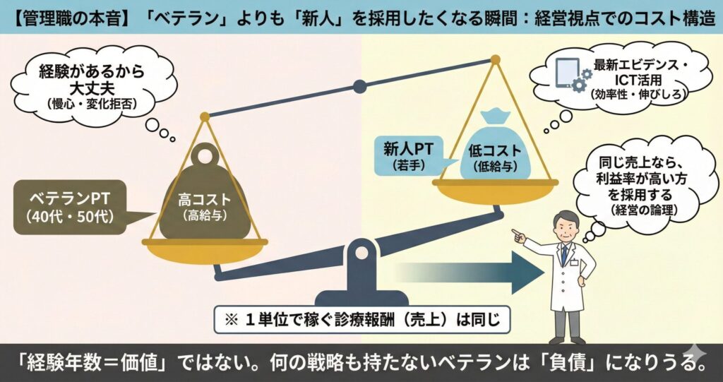 つまり、あなたが「ただのリハビリ作業員」である限り、キャリアを積むほど「利益率の低い、コスパの悪いスタッフ」へと転落していくのです。