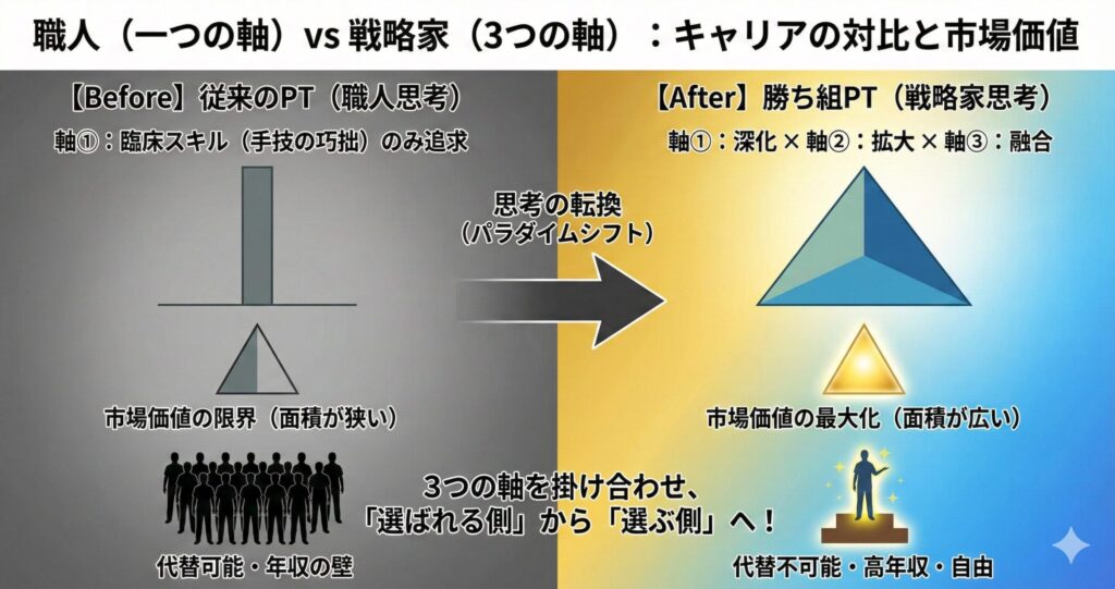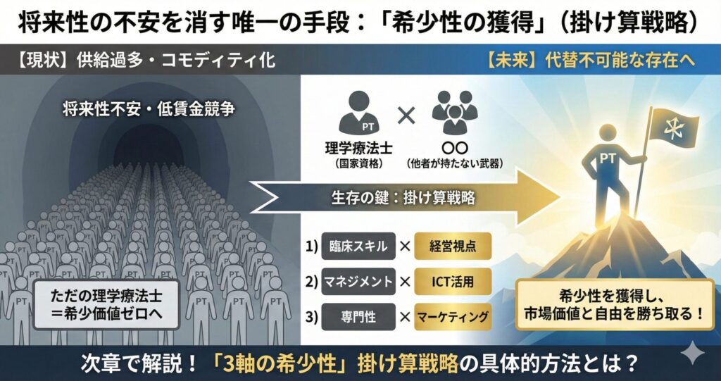 つまり、ただ「国家資格を持っているだけ」の理学療法士は市場に溢れ、価値が暴落する(コモディティ化)が確実に起こるのです。