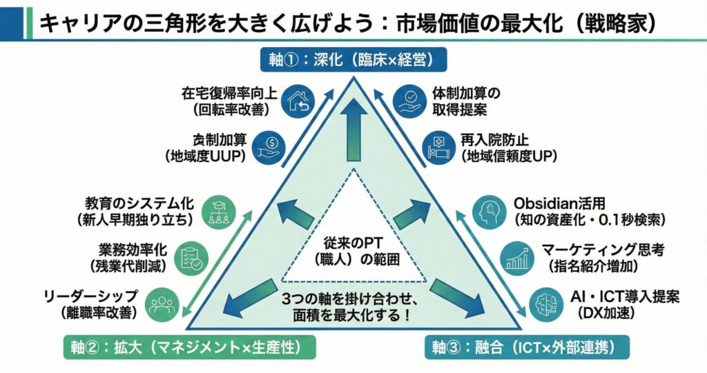 • インセンティブ制度がある訪問リハ、自由診療の自費リハ、あるいは経営層に近いポジションなど、「あなたの希少性が利益に直結する戦場」へ移動することを躊躇してはいけない。