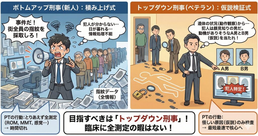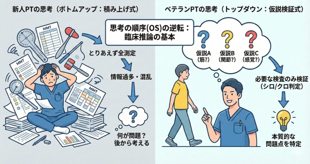 この記事は、 ベテランPTが脳内で無意識に行っている「臨床推論(クリニカルリーズニング)」のプロセスを言語化し、あなたの臨床を「単なる作業」から「専門職の仕事」へと進化させるための講義です。