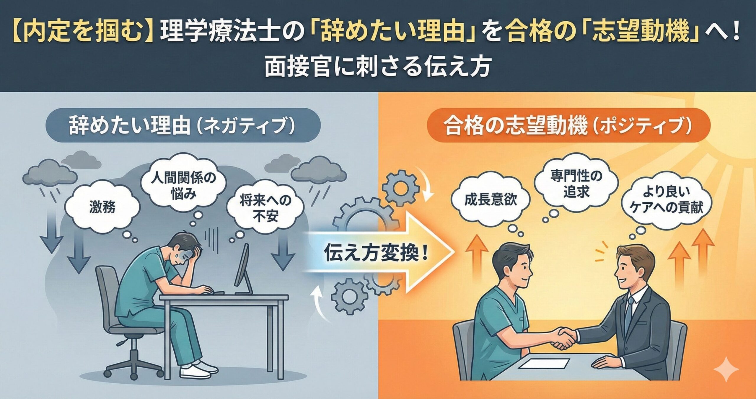 理学療法士の転職成功は、今の職場を「辞めたい理由」を、面接官が採用したくなる「志望動機」へと正しく翻訳して伝える能力で決まります。