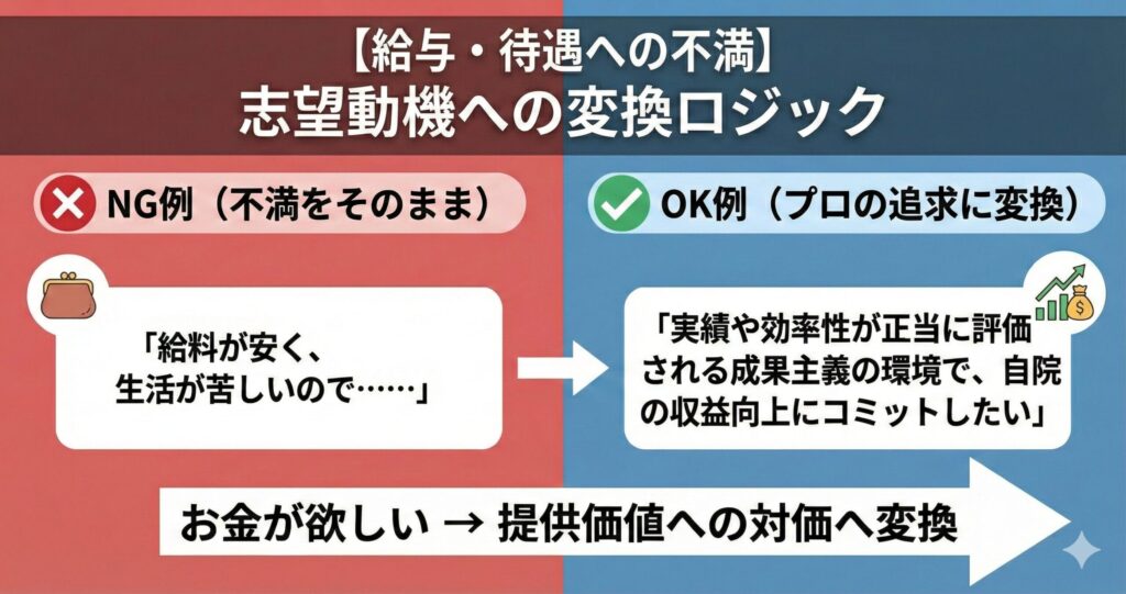 【給与・待遇への不満】→「実績と貢献度を正当に評価される、成果主義の環境への挑戦」
