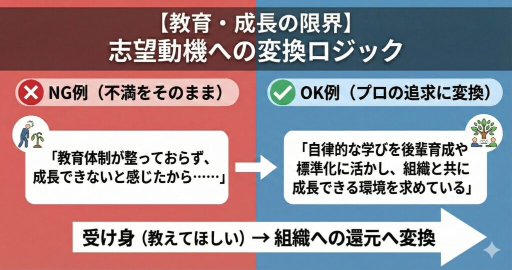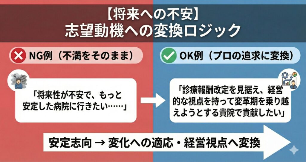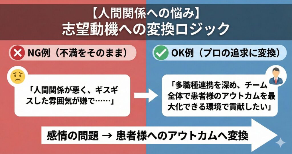 単なる不満は「逃げ」と見なされますが、それを「臨床環境への追求」という言葉に変換できれば、それは内定を決定づける最強の武器に変わるのです。