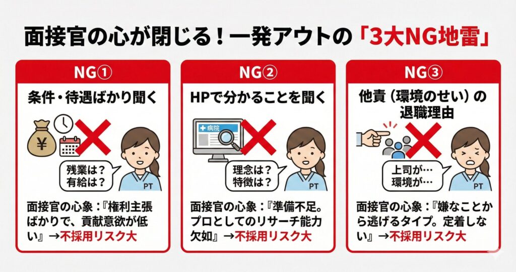 面接は減点方式ではありませんが、「一発アウト」の地雷は存在します。