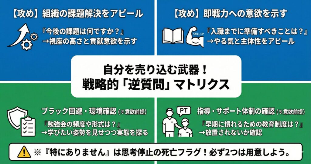 「攻めの質問」とは、自分を「病院の課題を解決する人材」として売り込むための質問です。