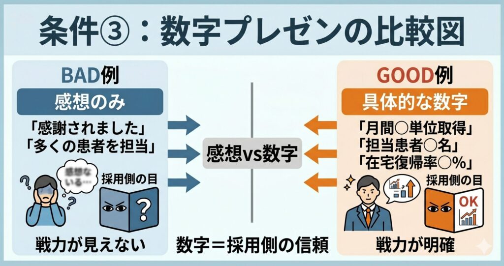 条件③:「月間○単位」「在宅復帰率○%」——数字で実績を語れる