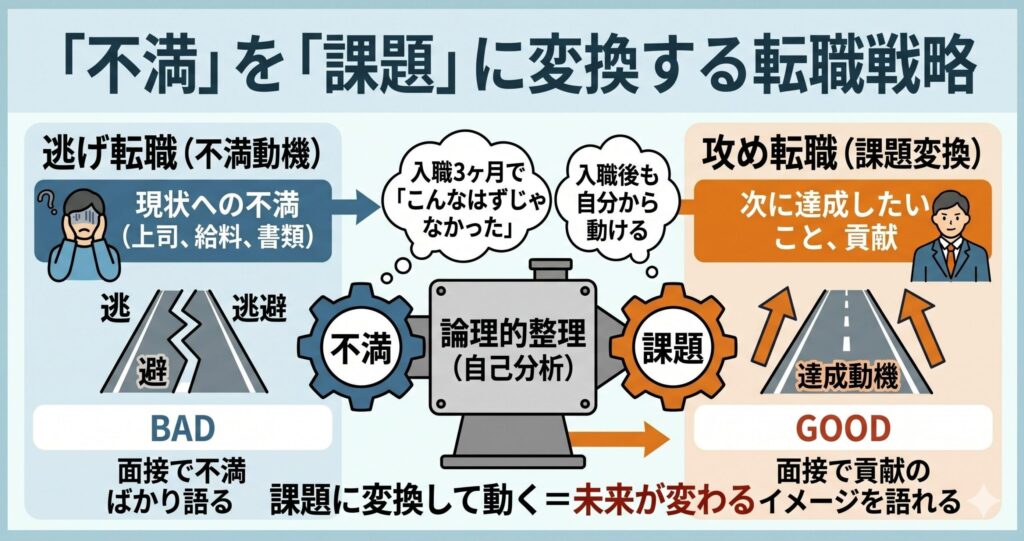 ただ、その不満を「解決すべき課題」として論理的に整理してから動くか、感情に任せてとにかく動くかで、転職後の結果は180度変わります。