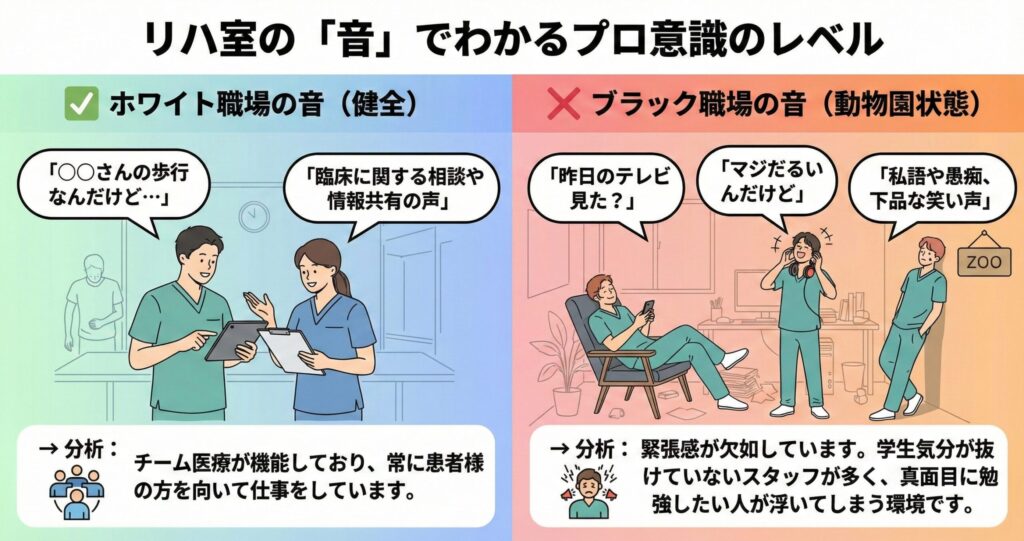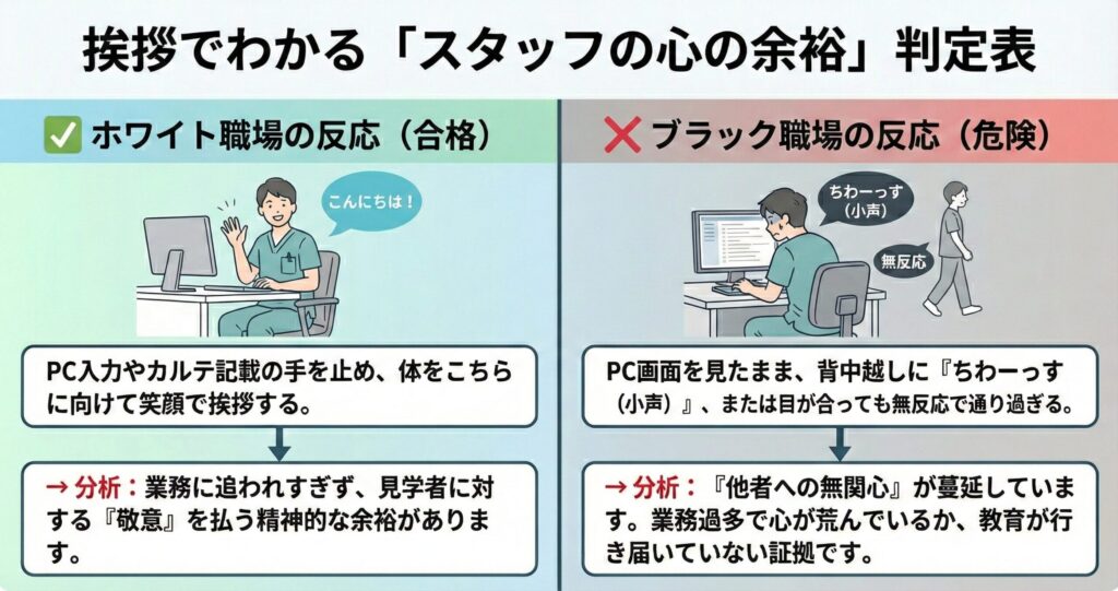 - 最も不潔になりやすい場所です。ここが汚い職場は、患者様に見えない部分でのリスク管理もずさん耳を澄ませば分かる。ブラック職場を見抜く「聴覚」の観察ポイントである可能性が高いです。