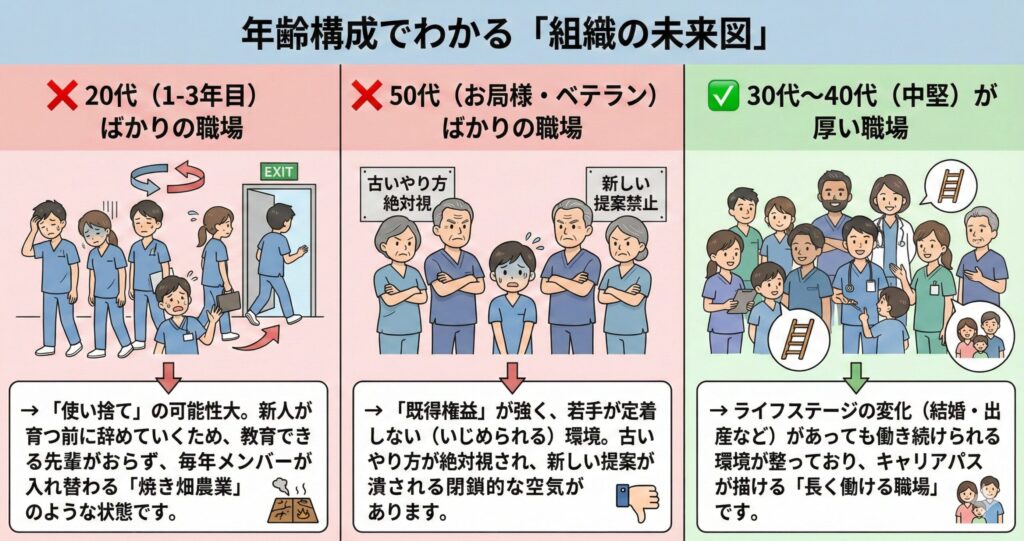 スタッフの「年齢層」に偏りがないかチェックしてください。
