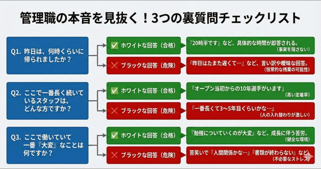 言葉を濁したり、「昨日はたまたま忙しくて」と言い訳が始まったら、恒常的な残業がある証拠です。