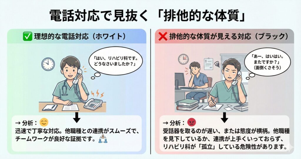 リハビリ室にかかってくる「電話」への対応も重要なチェックポイントです。