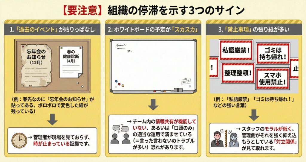 管理職の視点から言えば、見るべきは「挨拶・掲示物・床の隅」の3点です。