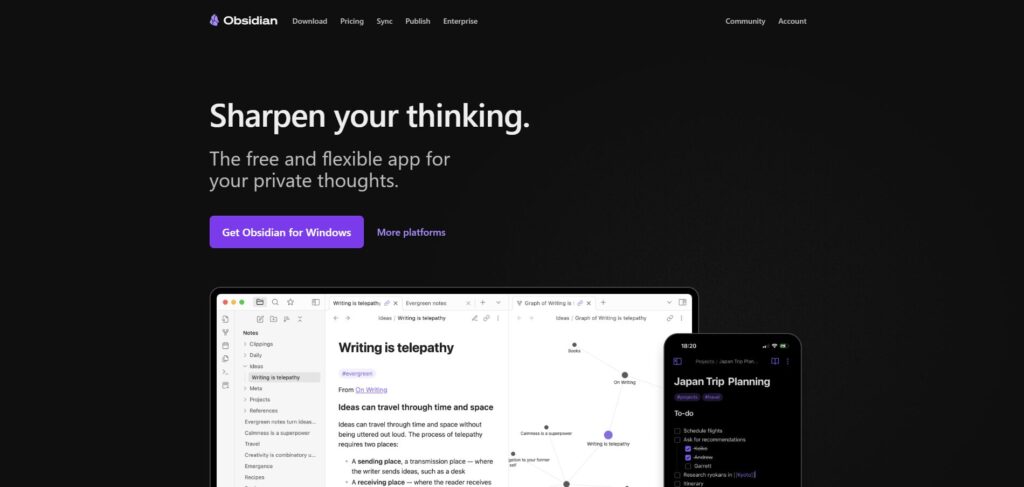 サイトが開いたら、画面中央にある紫色のボタン [Get Obsidian for Windows] をクリックします。
