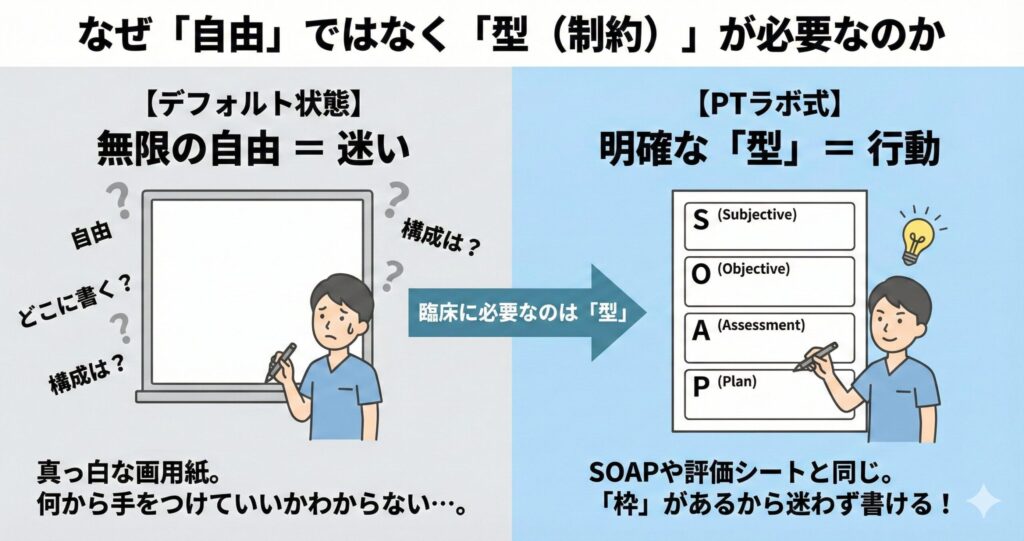 「ここに、これを書けばいい」という明確な「型(制約)」なのです。