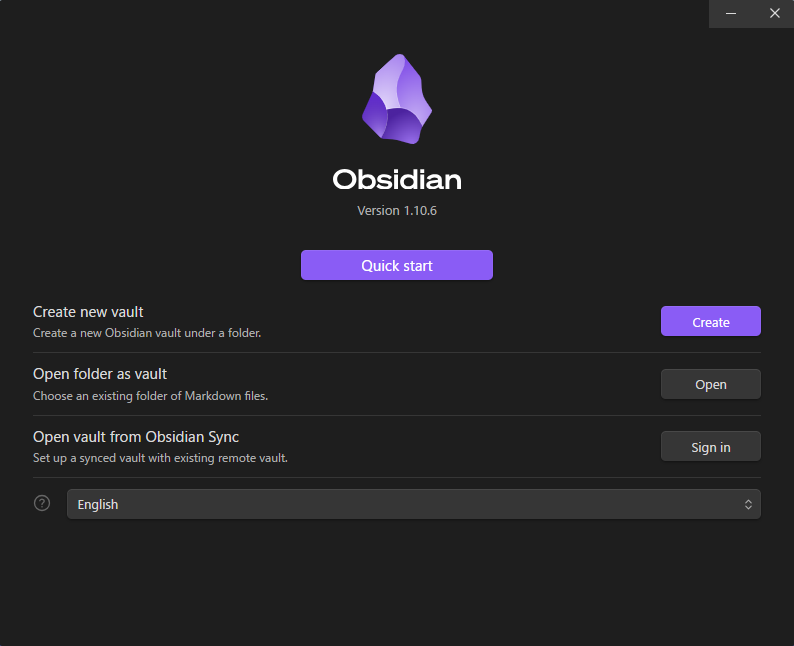 インストール直後のObsidianを起動すると、メニューが全て英語で表示されているはずです。