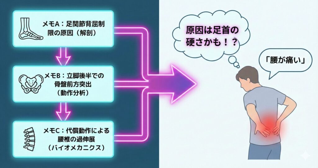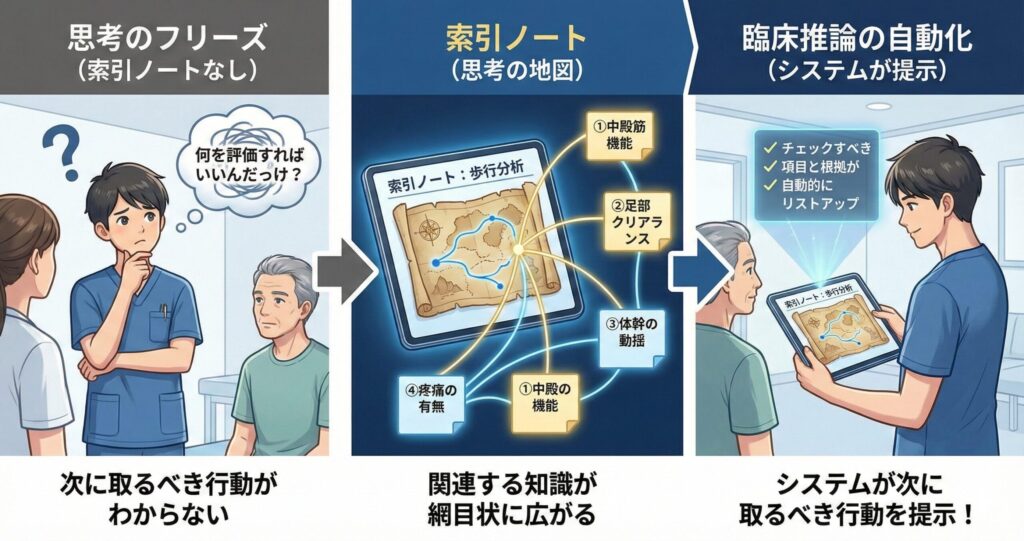 担当患者の「腰が痛い」という訴えを聞いた瞬間、ノートが勝手に「足首の硬さが原因かもしれないぞ!」と教えてくれるようになります。