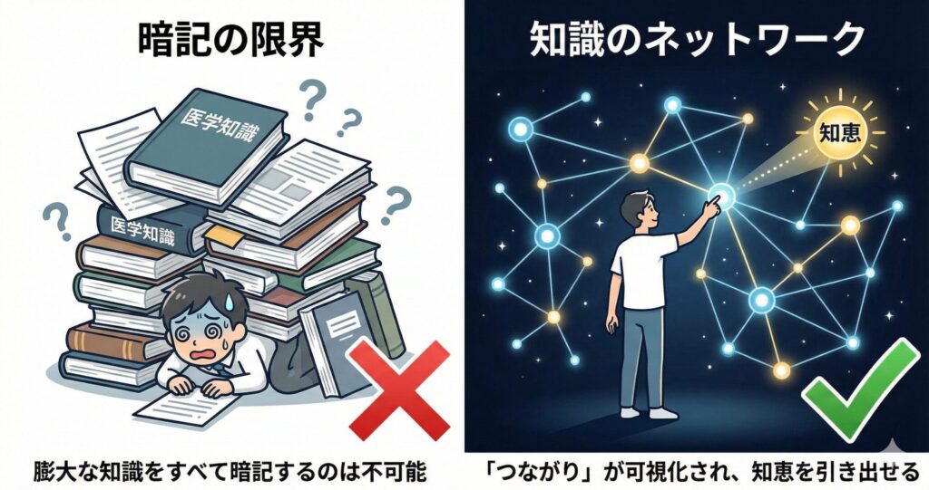 情報をきれいに整理整頓すればするほど、知識は特定の場所に閉じ込められ、実際の患者さんを前にした時に引き出せなくなります。