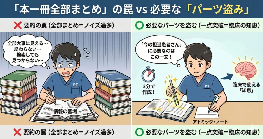 初心者が最も陥りやすいのが、参考書を一から十まで完璧にまとめようとする「要約の罠」です。