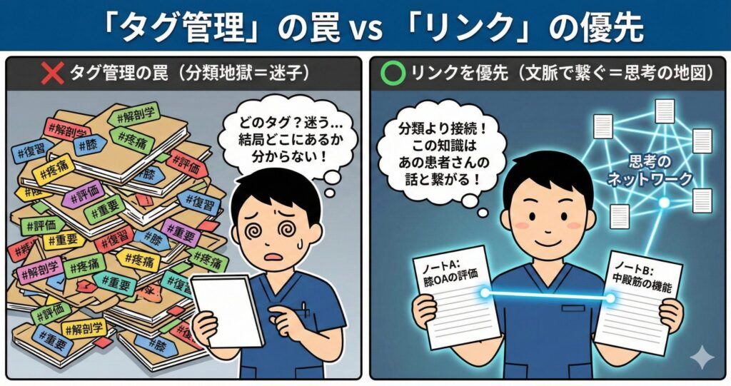 ノートが増えてくると、ついつい「#解剖学」「#膝」などのタグで細かく分類したくなりますが、これは「フォルダ分け」と同じ失敗を招きます。
