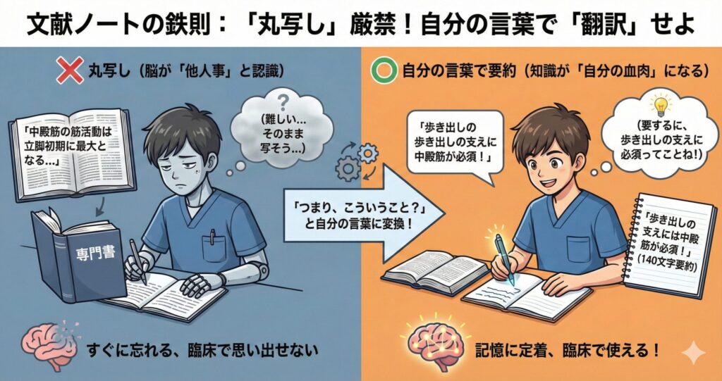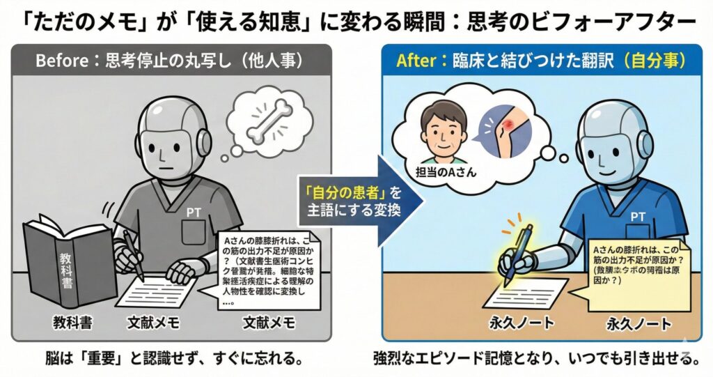 なぜなら、自分の言葉に変換しない限り、脳はその情報を「他人のもの」と判断し、臨床で必要な時に思い出させてくれないからです。