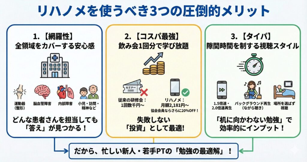 しかし、経験の浅い1〜5年目のPTにとって、リハノメは既存の研修会が抱える「構造的な欠点」をすべて解決しています。